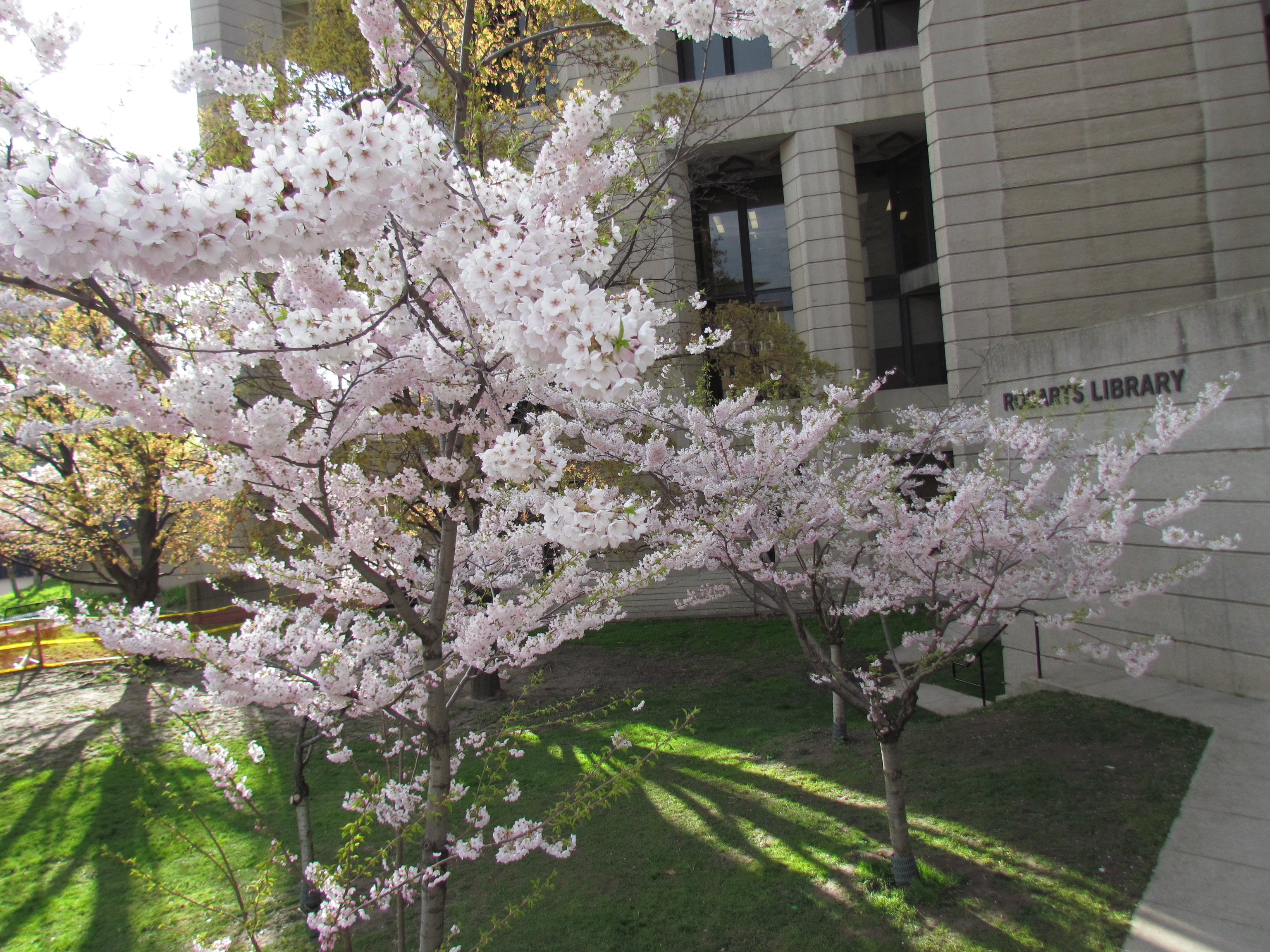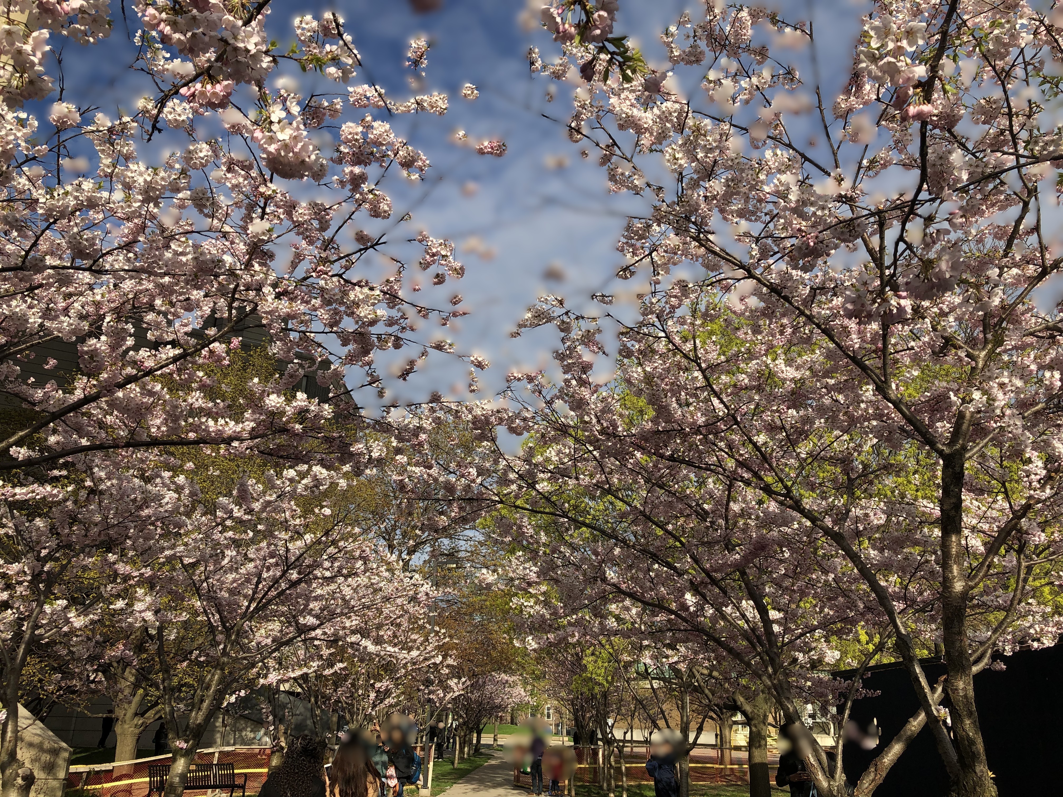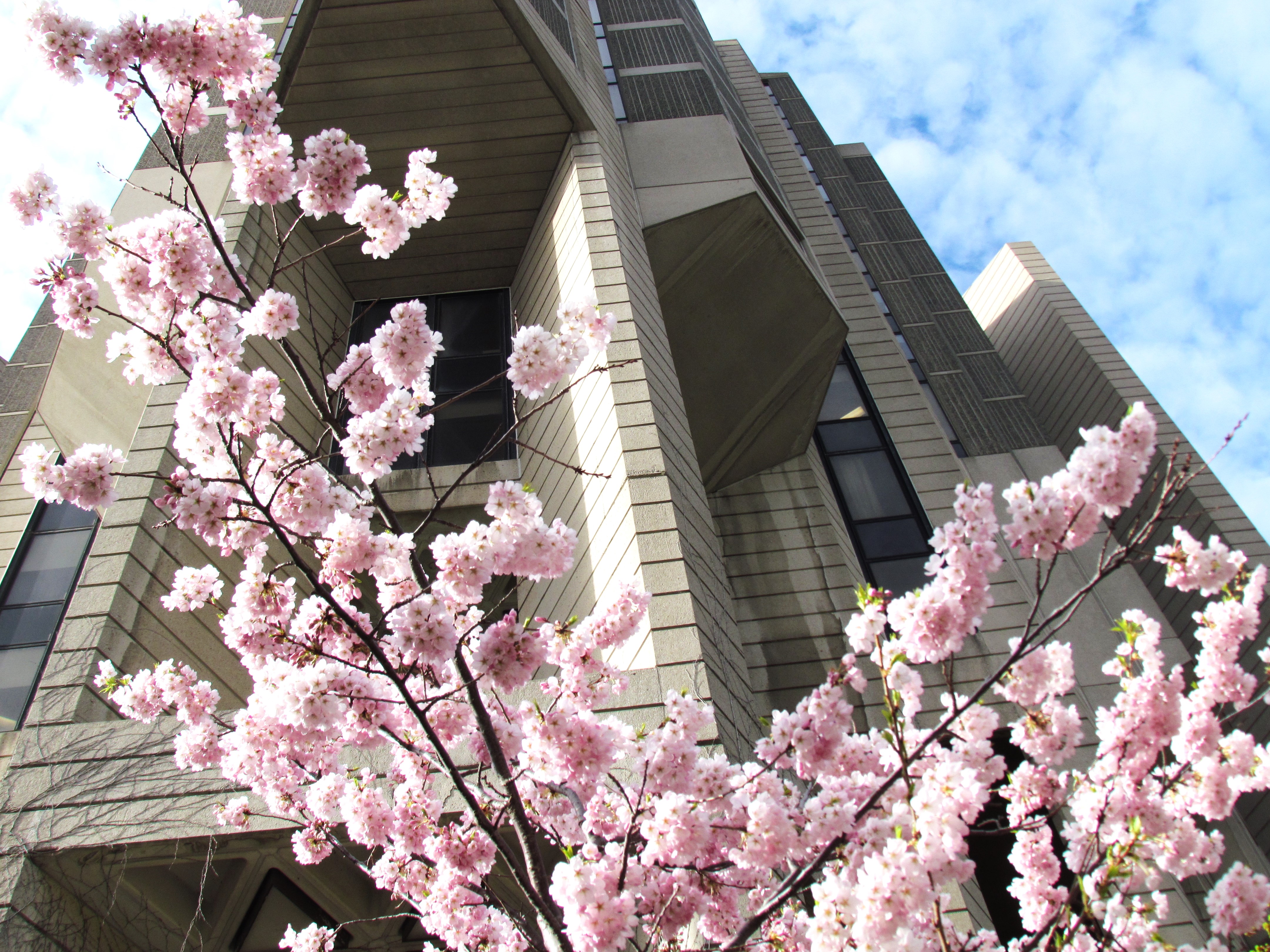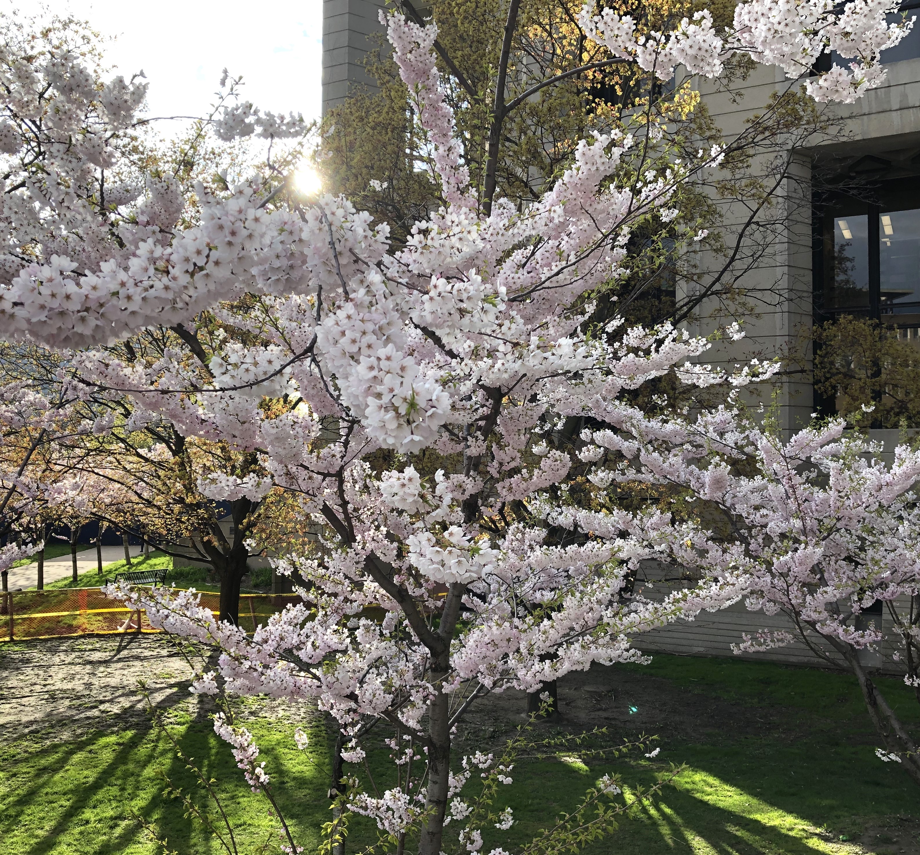 The library is home to more than 70 cherry blossom trees. They are located at the corner of Huron Street and Harbord Street.